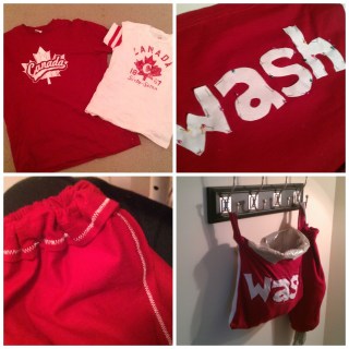 We have a set of hooks just inside our basement door (off the kitchen), and I used to hang a grocery bag there for all of my “kitchen laundry” — dish towels, dish cloths, bibs, baby washcloths. I also had another grocery bag there to hold — wait for it — empty grocery bags. It looked pretty crappy. So I grabbed some old T-shirts one Sunday during naptime, and threw together a laundry bag and a tube-like bag dispenser. (I still use a plastic bag INSIDE the laundry bag, so that I don’t have to wash the laundry bag) I’m not crazy with how the appliqued letters turned out — stupid stretchy T-shirt fabric — and now that the basement is painted, I may make a different set, but it’s still a big improvement from plain old grocery bags.