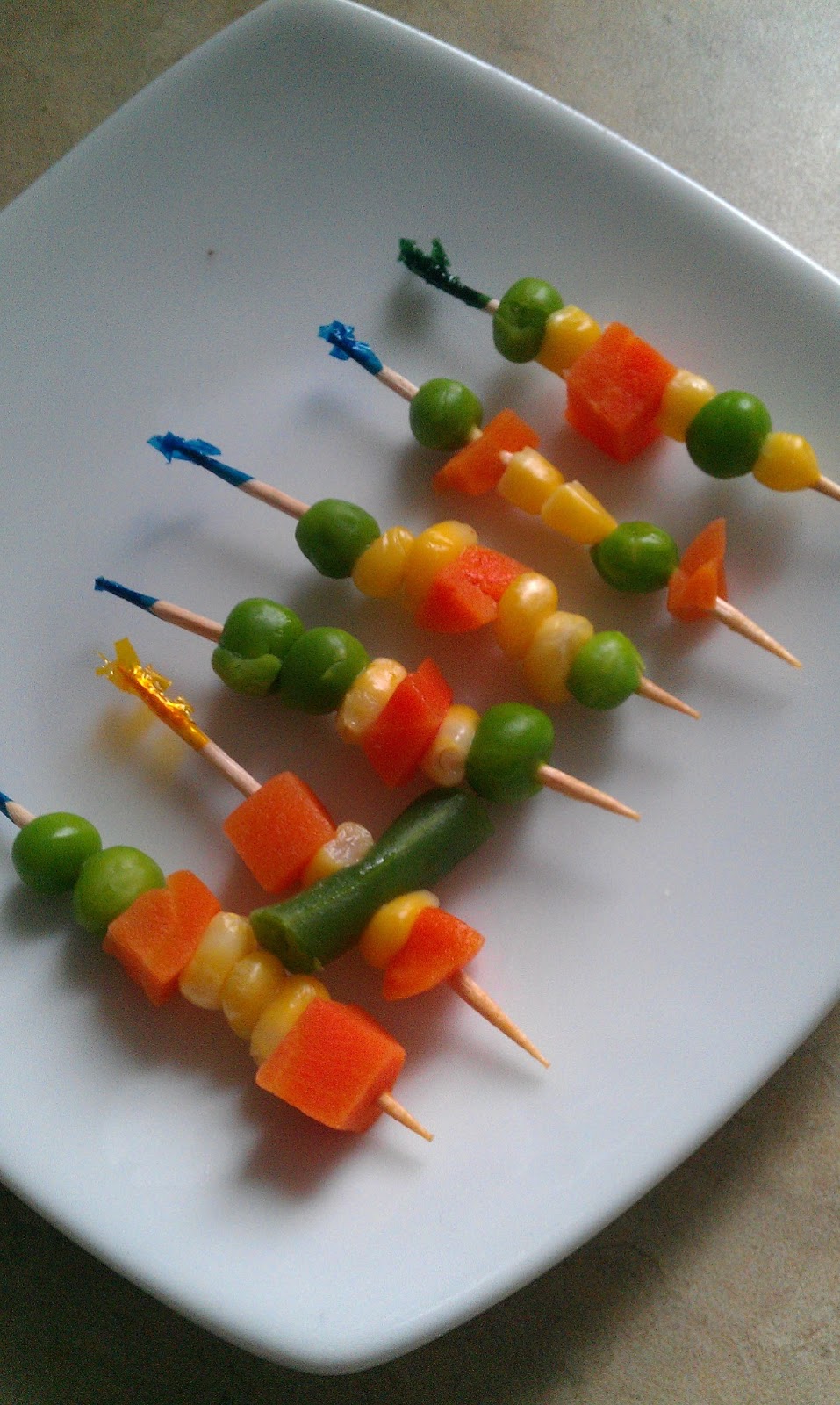 D is funny about vegetables — sometimes he loves them, sometimes it’s a battle. I was amazed when Darling Husband got the idea to make these cute little skewers about a month ago. D positively GOBBLED them down, while we watched in awe. We’ve done this trick since then, and it doesn’t always work, but it seems to have pretty good results.