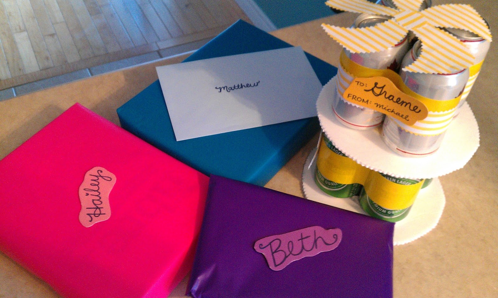 Our lovely next-door neighbours just had their second child (a baby boy), and I had bought a chic nursing cover for my friend, as well as a cute skull tee for the baby (I can never resist skulls), and a Big Sister present, of course. So I asked Darling Husband what he thought a second-time dad would like, and he immediately said “Beer.” Inspired by the popular diaper cakes, I taped a bunch of beer cans together, added a few scrapbook paper flairs, and we had a beer cake just for Dad!