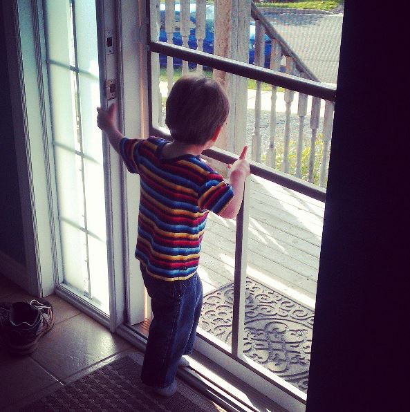| Little D attempting to strike up a conversation with a neighbour (who is much too far away to hear him) |