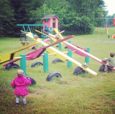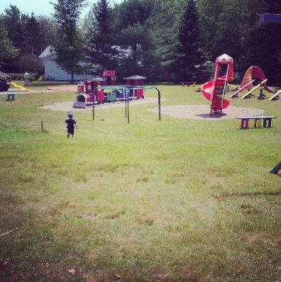 - We picked a campground with a lot of kid-friendly activities. For our first-ever camping trip with the kids, we picked a Yogi Bear’s Jellystone Park that was a little over two hours from our house. They had a massive playground that included big wooden structures to climb on (a train, a tractor), a pool that included a tiny kiddie pool and a splash centre, and one of those awesome giant jumping pillows. D was in heaven! Apparently during the “high season” (which started a few days after our trip), they also have bumper boats just for toddlers, mini-golf, sports, and organized activities with counselors. Definitely a great place to camp with kids.