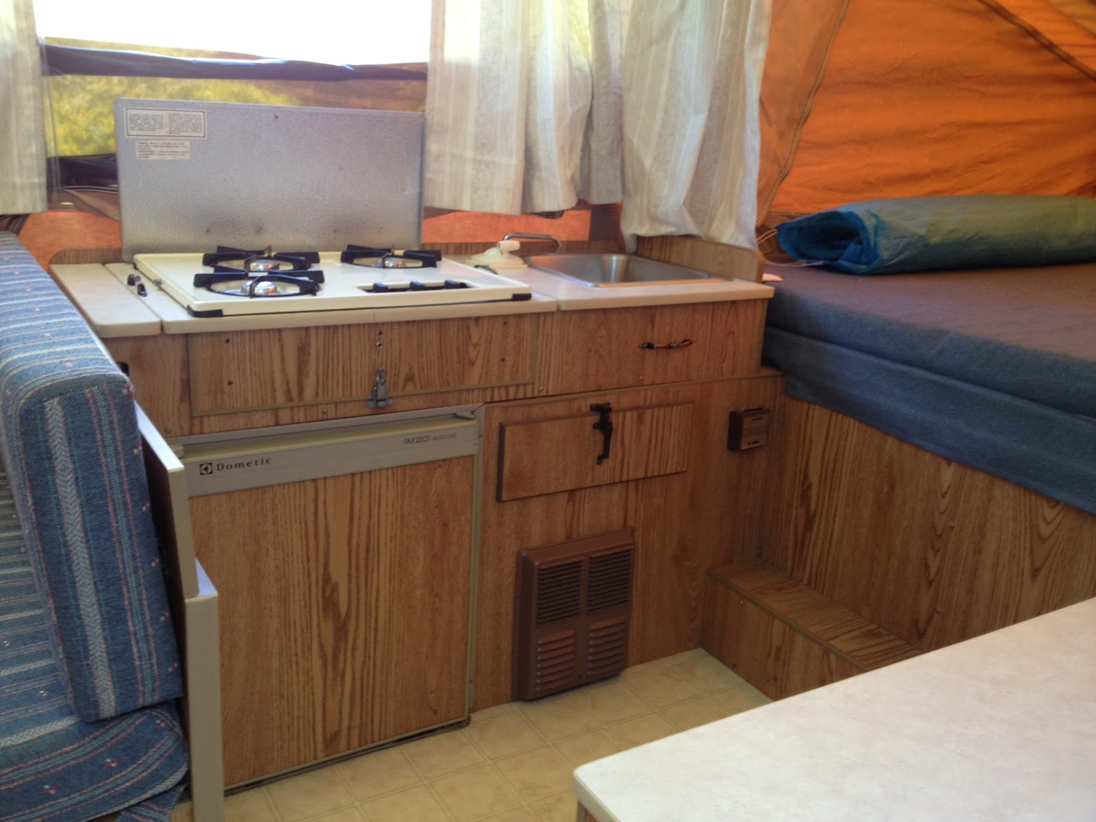- We collapsed the kitchen table and set up C’s playard on it. She’s pretty used to sleeping in her playard (naps at other people’s houses, etc.) so she was fine with this. It was the only place in the entire trailer that it would have fit, but it worked out well. She had her own little bed, and she fell asleep instantly. Win!