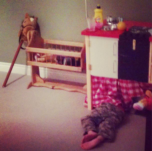 | This one isn’t a funny line, but a funny story that I shared on Instagram. D snuck out of his room at naptime to play in the toyroom (outside my office) as usual. I ignored him while I finished a call, and then I realized it was really quiet. I stepped outside my office and saw him fast asleep under the play kitchen. Guess he needed that nap after all!