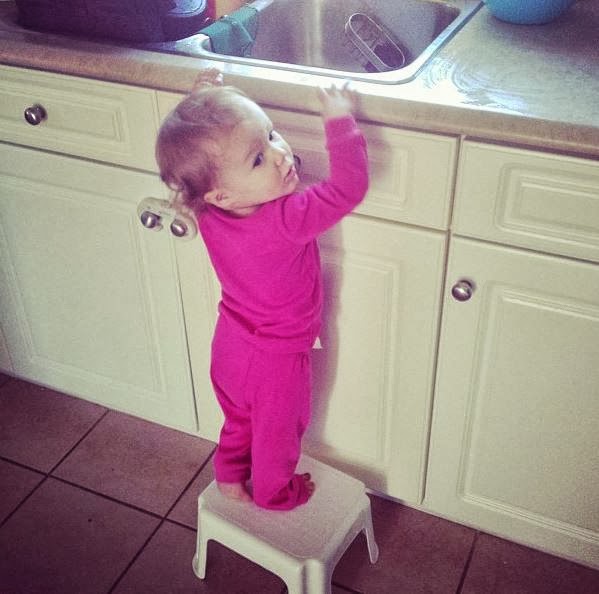 She loves to wash her hands. Who knew what would be a big thrill, but it is. She has also started dragging the (huge! heavy!) kitchen chairs over to the sink to wash dishes with me. At first she dragged her child-sized chairs or the bathroom stool over, but they didn’t let her get high enough.