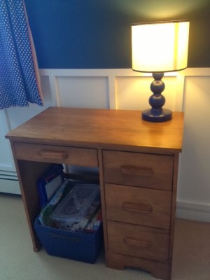 | He is thrilled to have his very own desk (“Just wike Mama”) but we still need to buy a chair for the poor kid. We were also able to bring back his blue lamp (Walmart) since he seems more responsible now (i.e. please don’t light the house on fire with it) |