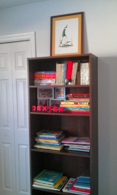 A huge improvement from his cheap old faux-wood bookshelf (uh, no offence to the person buying it from us today!) that was always a mess because he would just shove his books into random piles. And we could never find anything, which sucked when I was looking for a particular Berenstein Bear book!