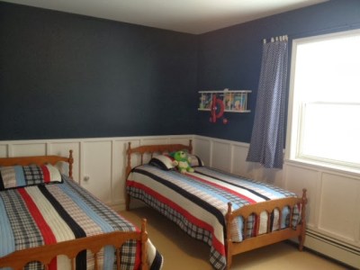 | His two beds are the same, and his bedding is the same, but everything looks nicer against the fresh board-and-batten and navy walls. Artwork to come! |
