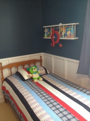 board-and-batten (thanks as always to Young House Love for the inspiration). I primed it (using leftover pale grey primer) and painted it white (two coats of off-the-shelf white in eggshell). And then we painted the top half of his room navy (Benjamin Moore’s Straffordshire Blue). I was overjoyed to see a nice, deep colour replacing that sickly old pale grey!