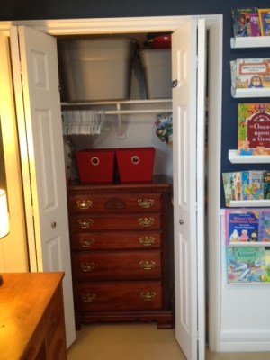 | Big development: moving his dresser into the closet to make room for a new (hand-me-down) desk! |