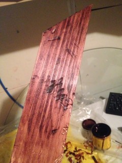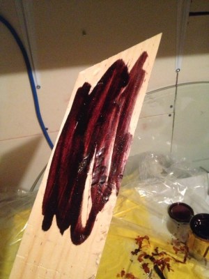I grabbed an old can of Minwax stain and a cheap craft brush, dabbed some stain on a board …