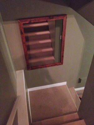 And here’s the finished product, once Darling Husband screwed everything into the wall at the bottom of the basement stairs …