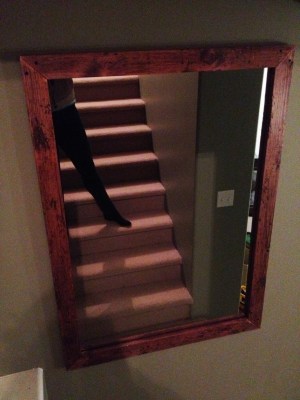 A mirror! I found a giant mirror! It was 30 x 42 (well, according to the sticker — measuring isn’t my jam) and it was marked down from $59.99 to $10! It was on clearance because it had some minor chips around the edges, but I knew we could cover those with a frame.