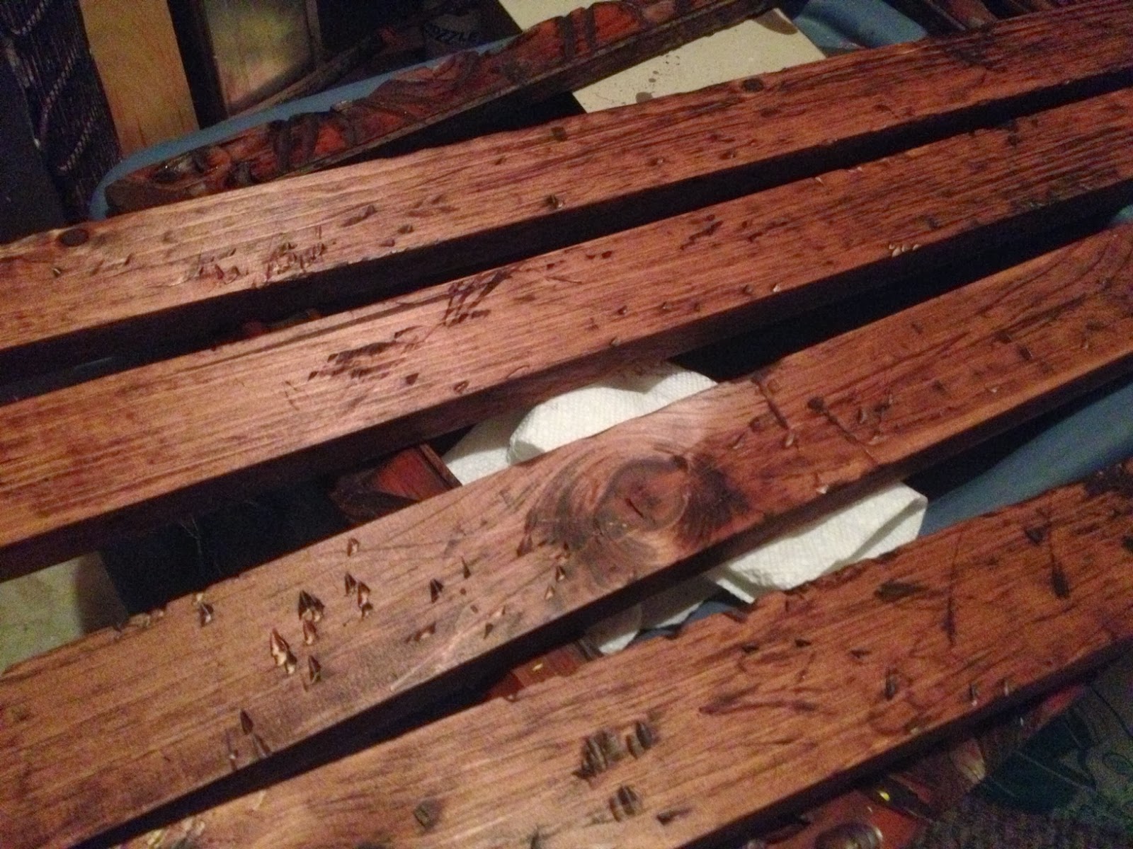 Here’s a before and after comparing the virgin boards to the banged-up/stained boards.