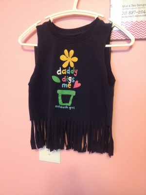 | C wore shirt last winter AND this winter, so I am super-bored of it. I never really loved it (it was a hand-me-down) but I liked the cute message of “Daddy digs me.” So I knew I could do something with it. |
