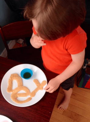 I used the ketchup bottle again this time, to spell out part of D’s name. Don’t mind that he’d already eaten part of the “X” when this photo was taken. |