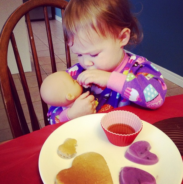 I used heart-shaped cookie cutters on our pancakes for Valentine’s Day this year. I also poured yogurt into heart-shaped silicone molds and stuck them in the freezer to make heart-shaped yogurt pop things. Heart-shaped EVERYTHING! |
