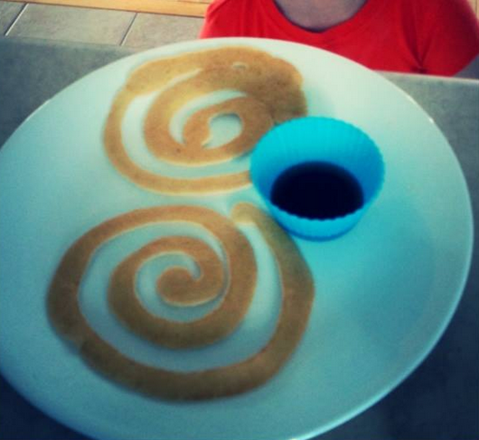 I got bored of making pancake horses the other day, so I felt a bit daring and decided to make spirals — mostly because I wanted to see how they looked against the black griddle (the answer: amazing). They were a bit tricky to flip, but well worth it. D was fascinated by them. |