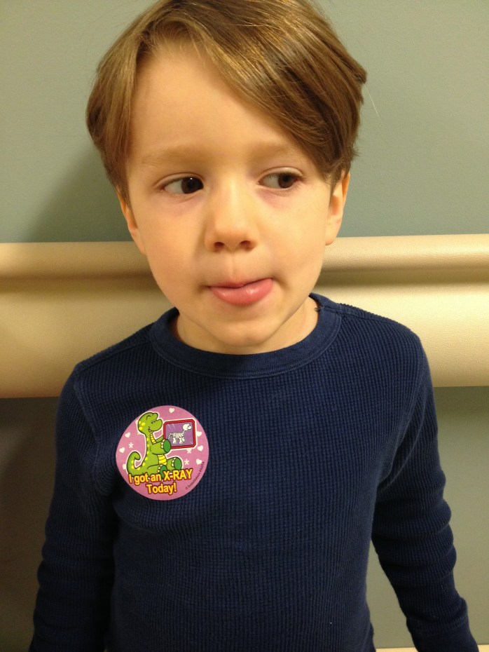 We were taken straight into the X-ray room, and Dexter quite enjoyed the whole process. The tech was very gentle, and kept making him laugh as he stretched out on the table so she could “take a picture of his tummy.” A few minutes later, he was hopping back down and getting stickers to share with Charlotte.