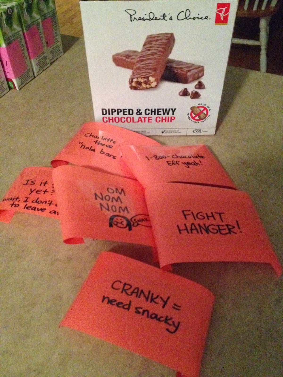Individually wrapped chocolate-dipped granola bars. Mmmm.