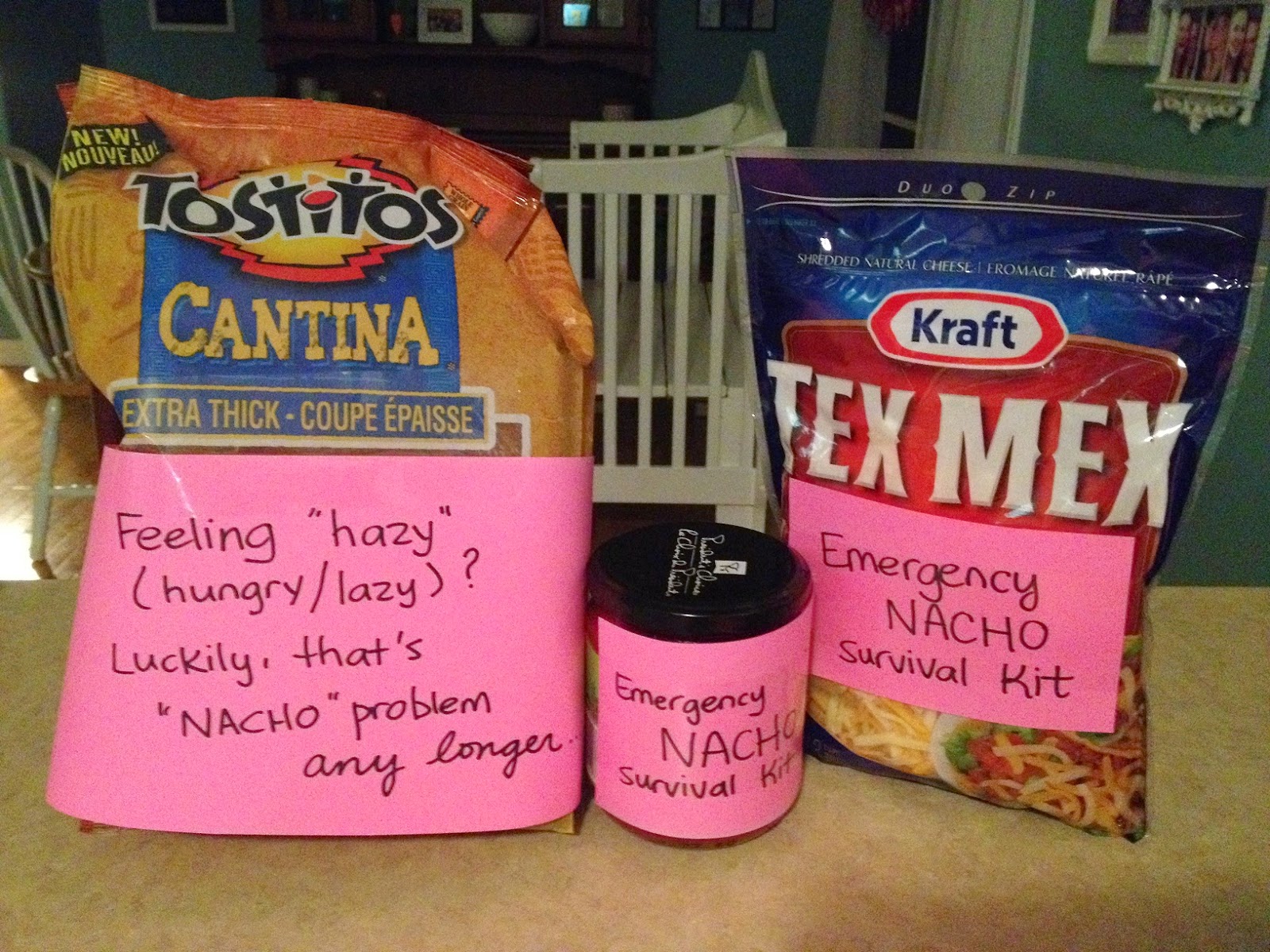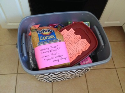 We are hardcore nacho people. So I made an Emergency Nacho Survival Kit with Tostitos, salsa, and pre-shredded Tex Mex cheese.