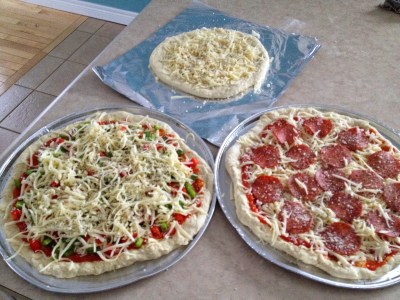 Little Sis loves my homemade pizza, so I made a vegetarian one and a pepperoni one (using our favourite “good” pepperoni). I also made garlic fingers with lots of cheese, mmmm. Everything was frozen, uncooked, on disposable pans with the baking instructions.