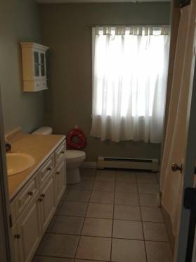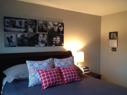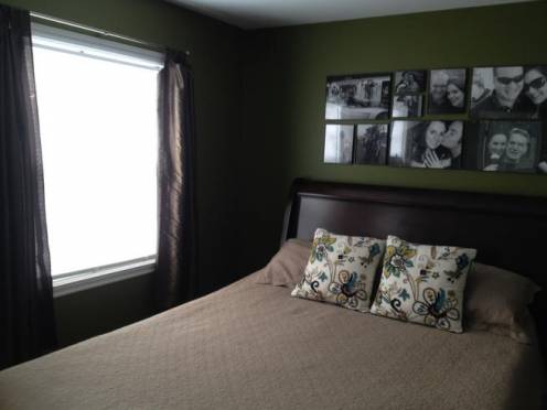 Leading up to this week, we’d re-painted the walls (Benjamin Moore’s “Revere Pewter”), made no-sew curtains, hung new curtain rods, built and upholstered pelmet boxes, frosted the bathroom window, and created engineering print artwork.