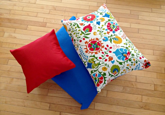 If you’re making covers for a bunch of cushions at once, it’s much faster to do them in batches. Once you’ve tried one cover on your “model” (the cushion) and it looks good, turn it inside out and use it as a template for the others.