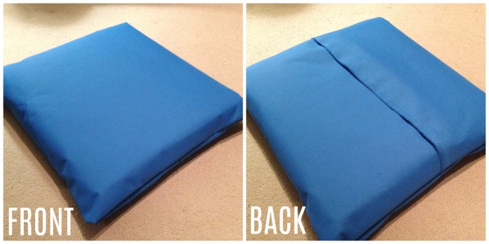 6. Turn the cushion cover right-side out. If you’re fighting with heavy waterproof fabric, this step is tiring on the arms!