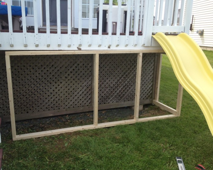 But after a couple of summers of enjoying the slide, I was sick of staring at the overhang of the deck. I decided we could do something fun with that part of the deck, too. After all, it wasn’t doing anything more than serving as a patch of gravel to store our ladder. It could be … a clubhouse!