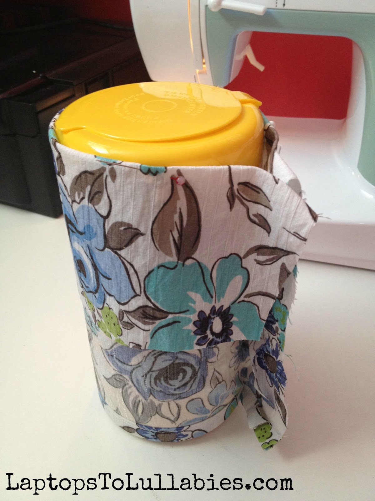 Step 3: Fold down the top (towards the inside) and pin where it reaches the top of the container. Hem the top.