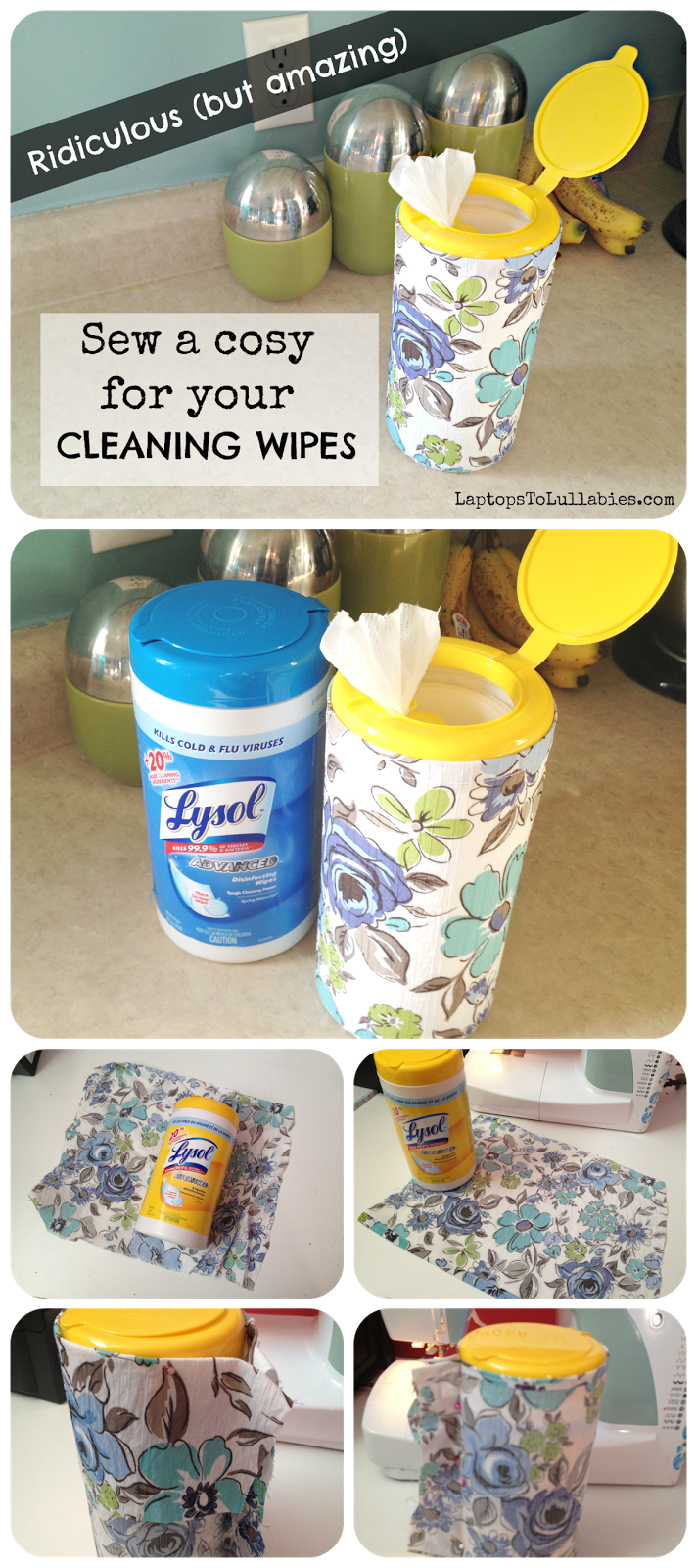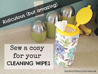 Step 4: Wrap the cosy around the container (right side touching the label) and pin along the side — nice and tight, so your cosy fits like a snug pair of skinnies. Sew up the side, and you’re done.
