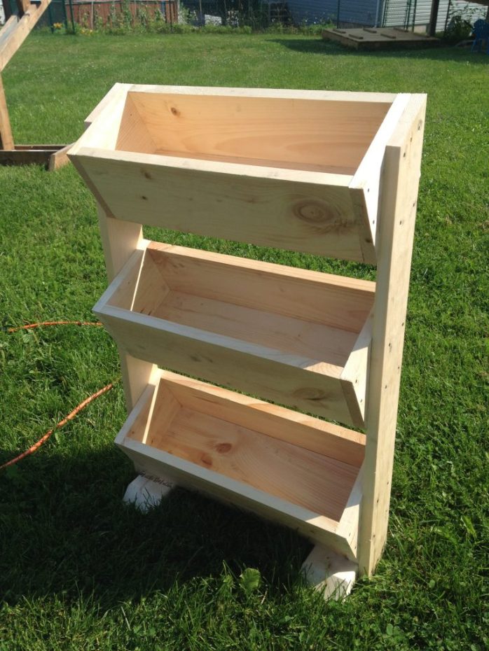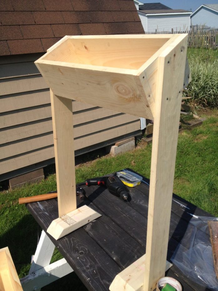 Once I calmed down about the boxes, it was time to attach the sides to the base supports. Make sure you screw or nail the sides to the bases so that the angles are facing the right direction, because the very top box needs to line up with that angle.