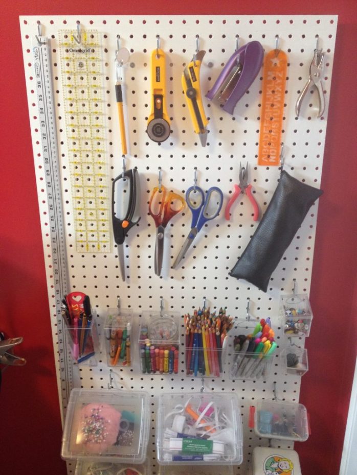 I eliminated one of my bookcases as part of this makeover, so I needed a spot to hold my tools of the (crafty) trade — scissors, rulers, cutting blades, etc. I’ve kind of dreamed of having a pegboard ever since reading “Berenstain Bears and the Messy Room,” so I bought an unfinished 4’ X 2’ pegboard for $4.99 and a package of 32 assorted hooks ($3.49).