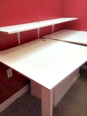 We asked the building supply store to cut the melamine panels 36” wide and 6’ long, and the other 36” wide and just under 3’ long. This meant the entire desk surface was literally done for us — we just had to install it.