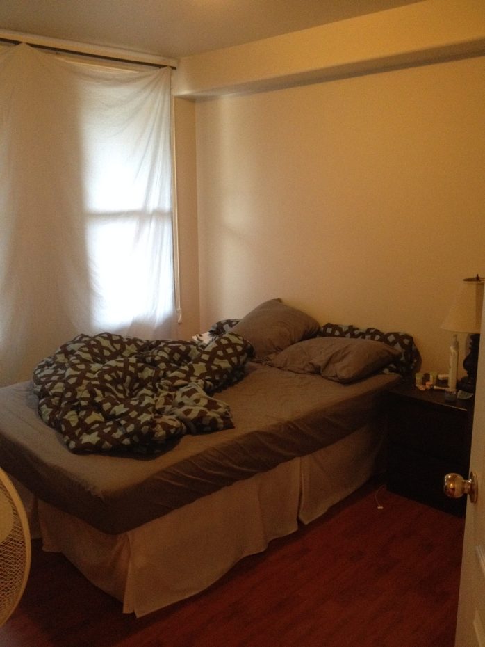 I also brightened up the couch with more throw pillows, and hung up the living room curtains I’d sewn. All together, we (well, she) spent just under $250 to dramatically change the two main areas of her apartment.