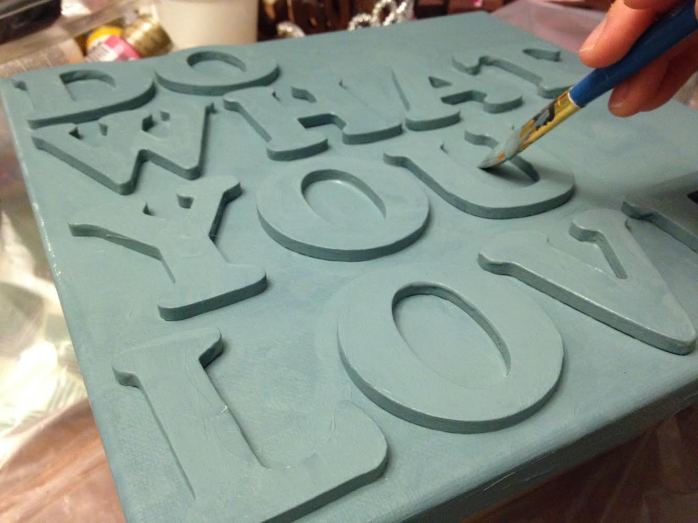 Once the second coat was dry, I gave it a distressed look by dragging sandpaper across the canvas and roughing up the edges of the letters to show off their original white finish.