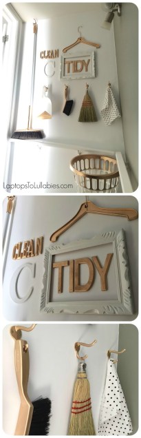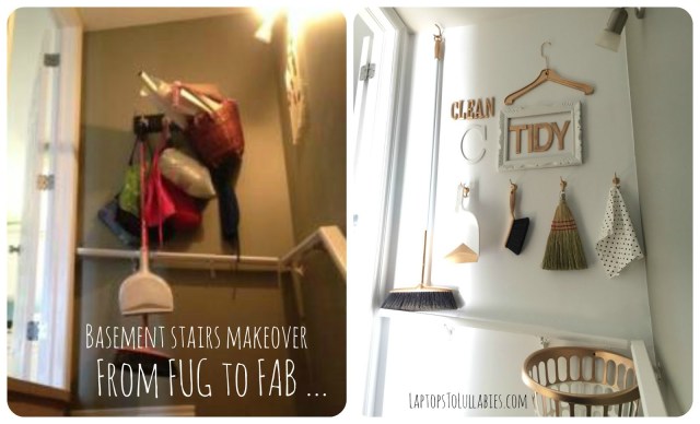 The top of our basement stairs? Total wreck, all of the time. I’d hung a set of hooks in an attempt to organize it, but it just allowed us to pile more junk onto them. Plastic bags, the broom, the dustpan, aprons, cans to be recycled, papers that needed to be filed, dishcloths to be washed — it was depressing to walk past the stairwell.