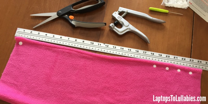 I did an “innie” snap on one end, and four “outie” snaps on the other end so it was adjustable, but we just use the tightest snap. So really, you just need one? Unless your kid’s head changes sizes, which … apparently I thought mine did …?