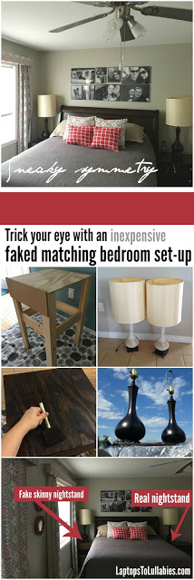 Although my dear husband didn’t mind charging his iPhone on the floor, it bothered me that we didn’t have the pleasing symmetry of a nightstand — and lamps — on either side of our bed. Of course, my nightstand was so huge we couldn’t fit a matching one even if we decided to shell out the $300 or so.