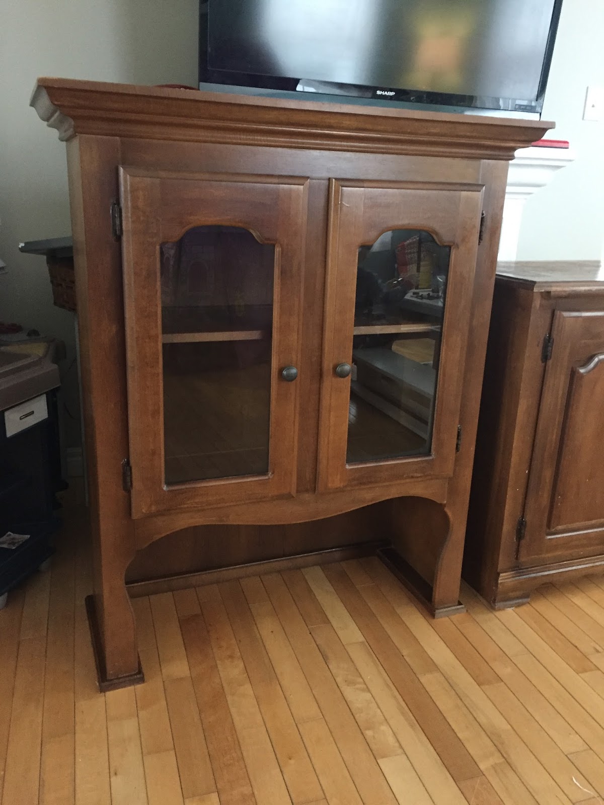 Luckily, fate stepped in. Remember a few weeks ago when my friend gave us her old hand-me-down dining room hutch? It was a standard two-piece with a lower bank of cabinets and an upper section with glass doors and shelving.