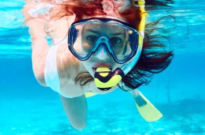 It took two of us to yank the swim cap down over my head and clip the mask over it so it didn’t pop off and the flippers needed a lot of adjusting. But soon I was blissfully floating around in my own little world.