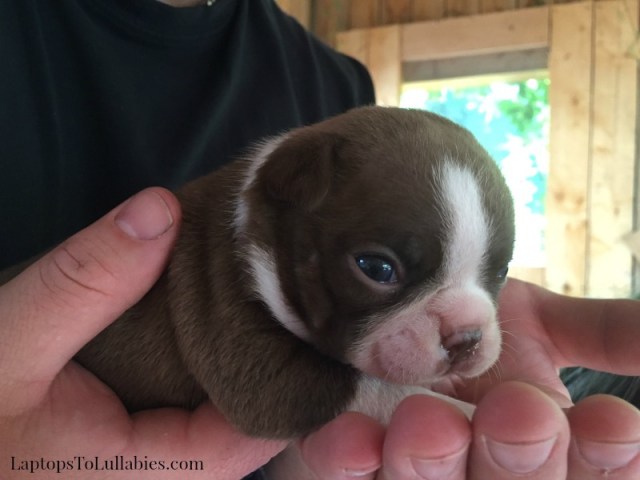 We are smitten with this tiny Chocolate Boston Terrier we have named Annabelle, and we’ll bring her home on August 27, 2016 when she’s eight weeks old.