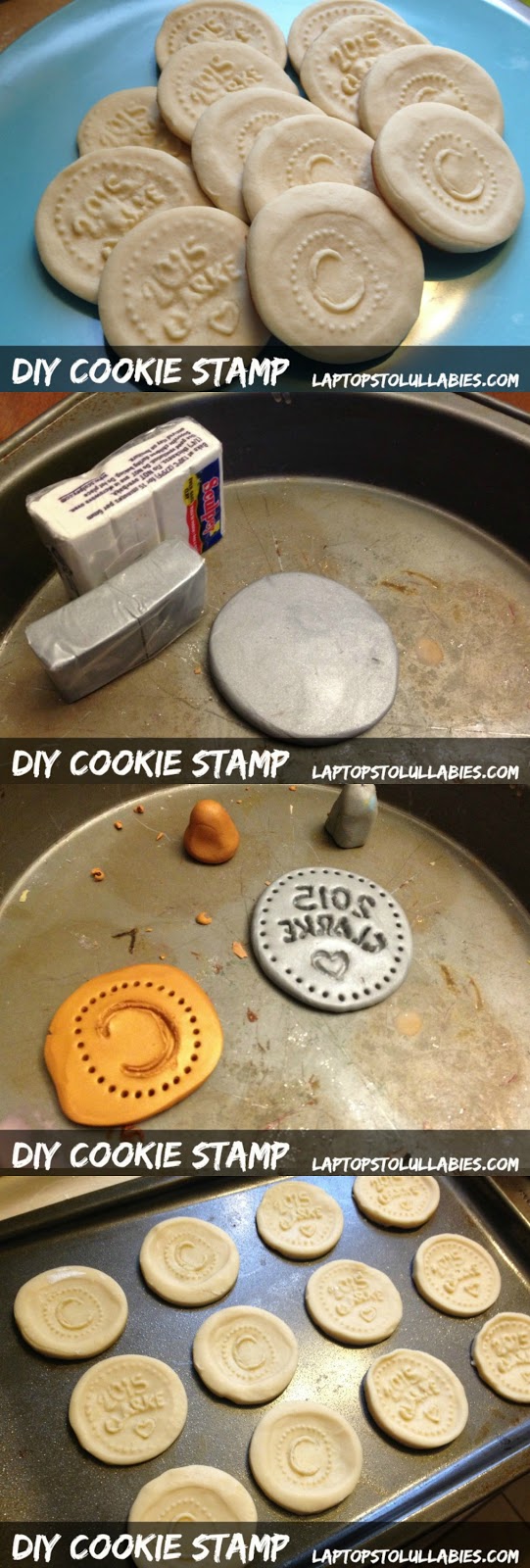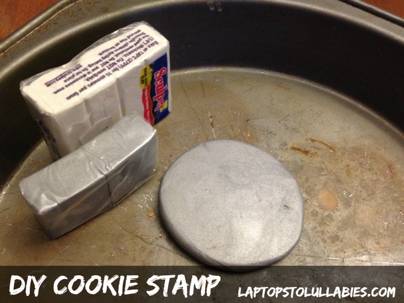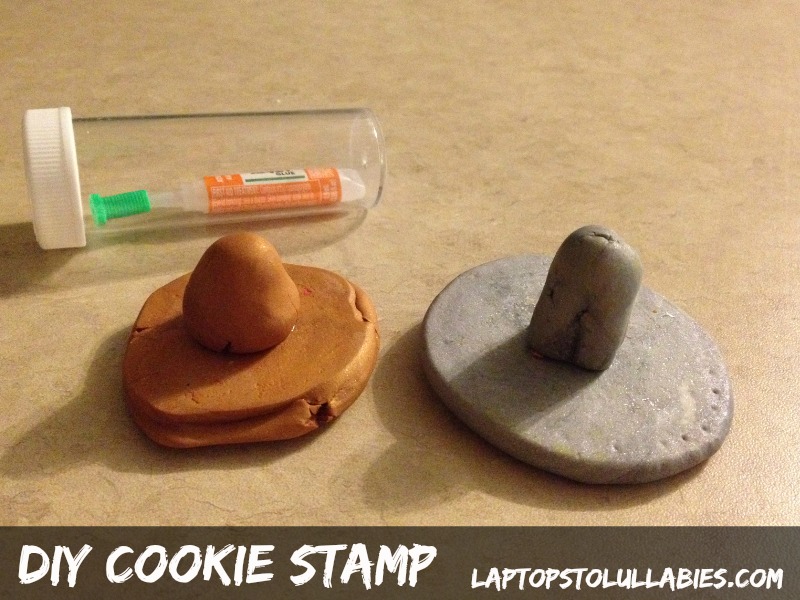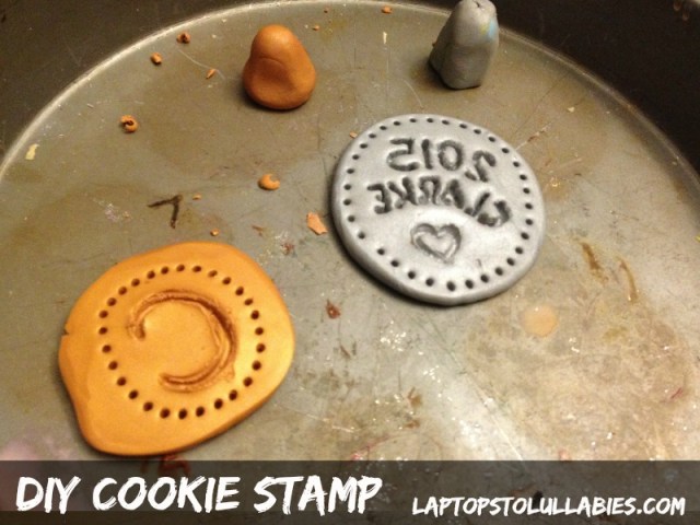Mould a little handle for each stamp (a lumpy thing is fine — nothin’ fancy) and use pointy clay tools (or plain old toothpicks) to make your design in the stamp. Make sure to do a mirror image of the design you want on the cookie.