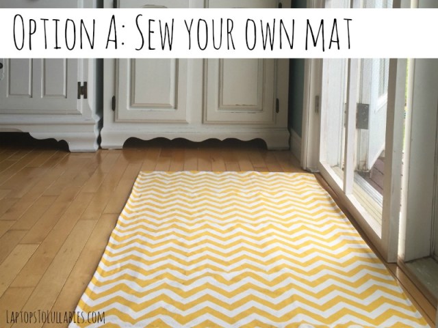 I started out easy, testing a method where you needed nothing at all but about a metre of fabric and a sewing machine. I chose a fresh, fun white and yellow chevron print from Atlantic Fabrics’ home decor section, prewashed and dried it, just in case, and spread it out on the carpet in our family room.
