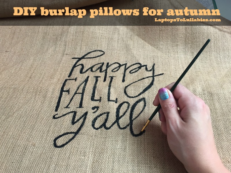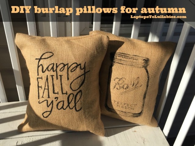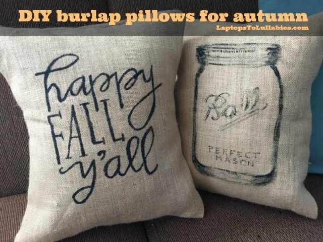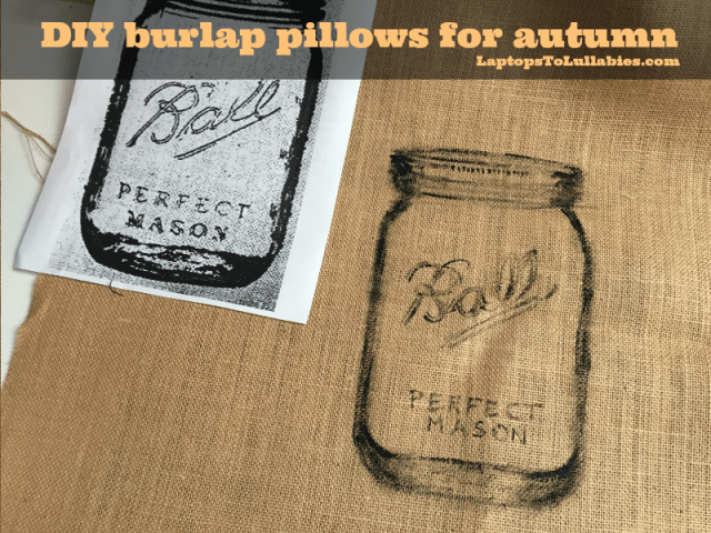 I cut four large squares of the burlap — two for pillow fronts and two for pillow backs — knowing I’d trim them down to size later. Then I scoured Pinterest and printed off two images I liked: a mason jar, and “Happy Fall, y’all.” (A large portion of the crafty projects on Pinterest originate in the land of sweet tea.)