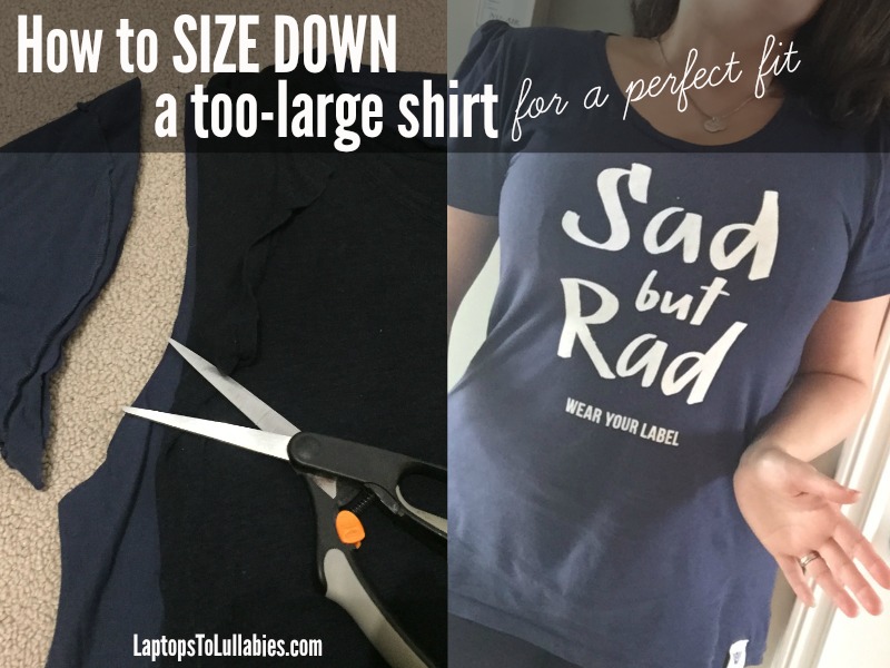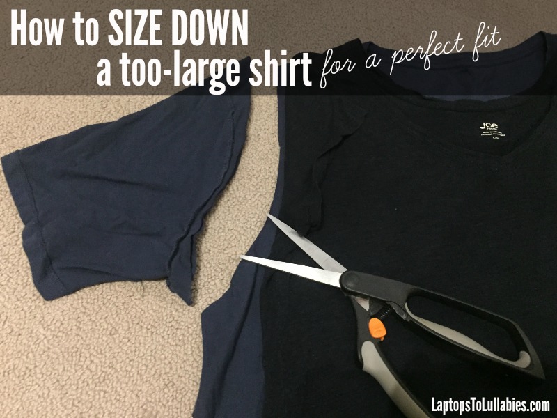 Using the nicely-fitting shirt as a guide, cut off the excess fabric from the big shirt. If the sleeves are also too big, you’ll want to cut those suckers right off so you can make smaller sleeves.