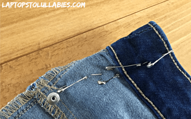 Start by putting your jeans on and pinching the excess fabric (no, not excess skin) at the waist and seeing how much you need to take them in. For me, it was a good one-inch-pinch on either side, which actually takes four inches off from the total waist.