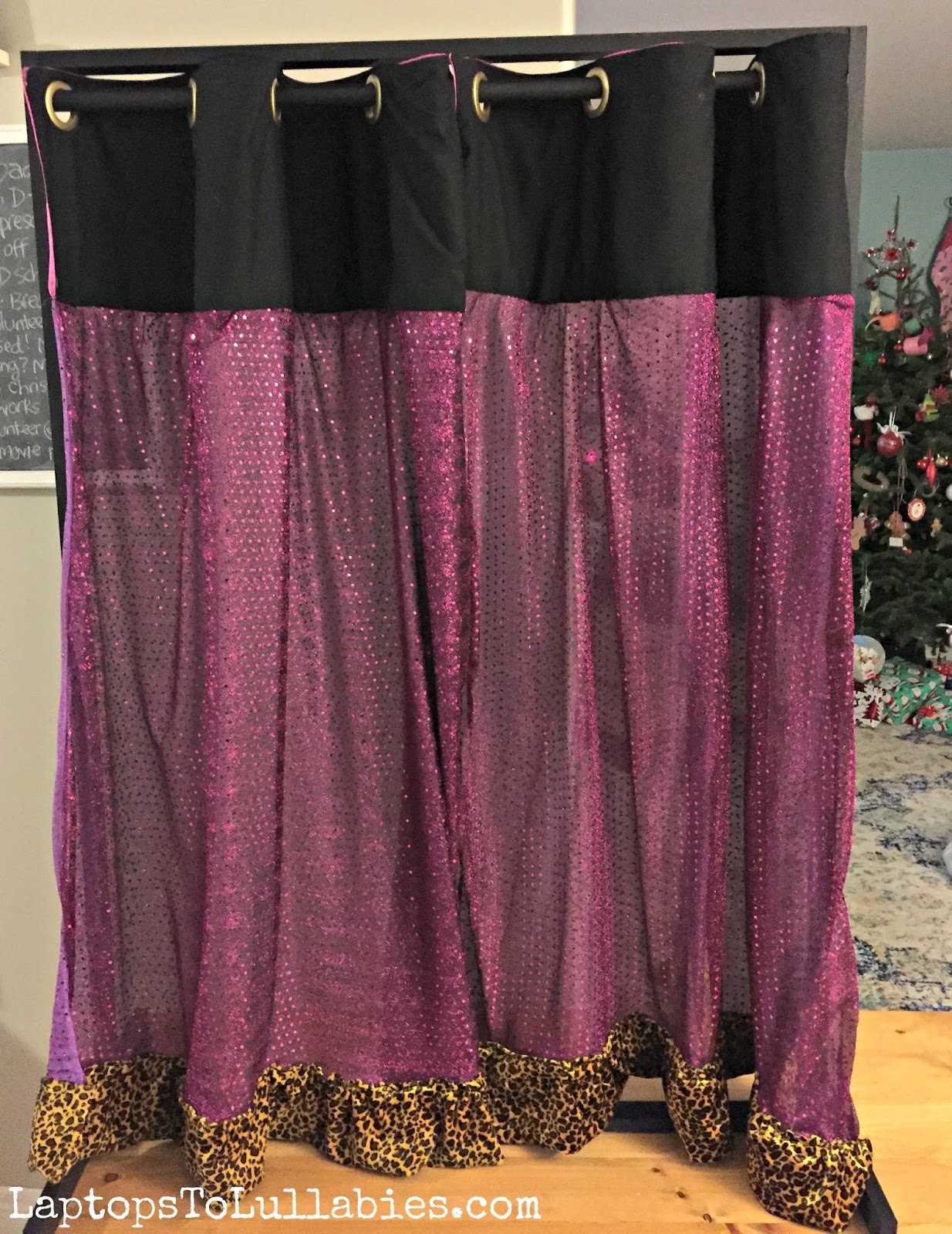 Each panel needed to be 53″ tall and my sparkly fabric wouldn’t have been thick enough to support grommets, so I added a top border AND a leopard print ruffle.