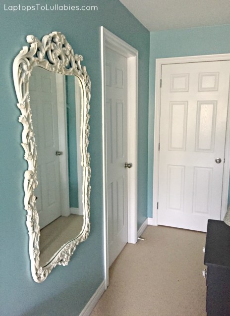 The kids don’t always help me with DIYs —especially painting projects — but I figured there was no harm in getting her ‘assistance’ with the mirror. I knew I could scrape any paint globs off the mirror’s surface and the table was protected …