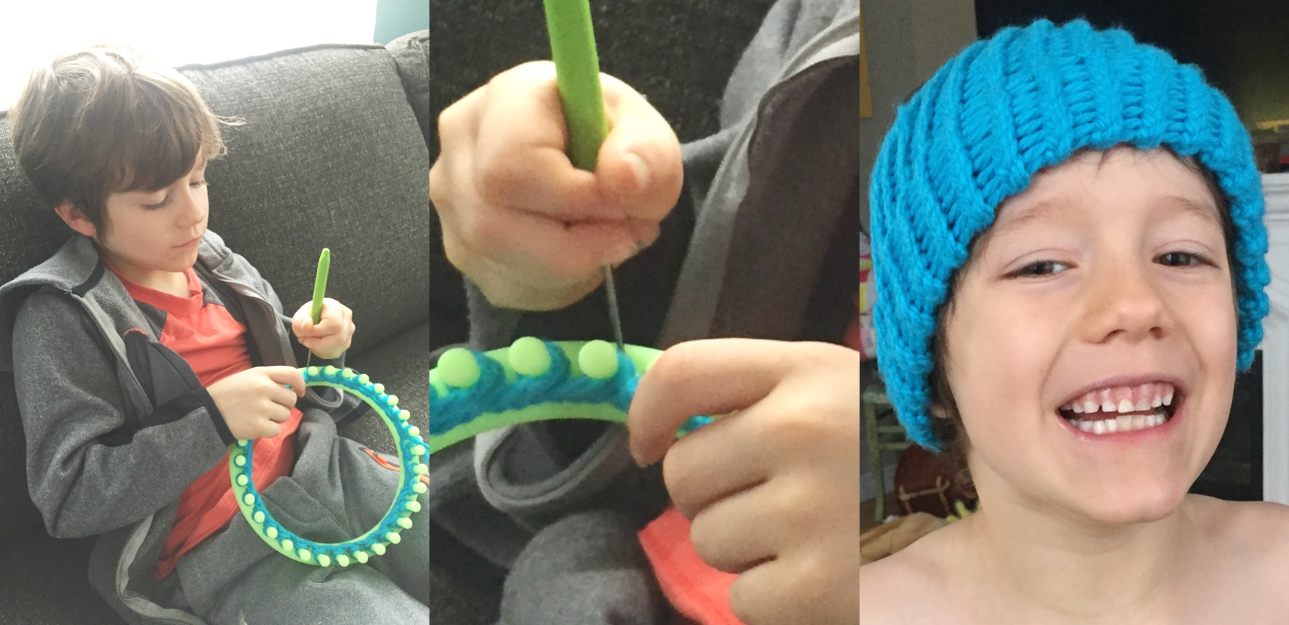 You just wrap the yarn around the pegs and lift up the loops, basically like the Rainbow Loom bracelets my kids love to make. No eye-pokey needles? I was sold and our son was desperate to give it a try. He actually started talking about opening a hat store.